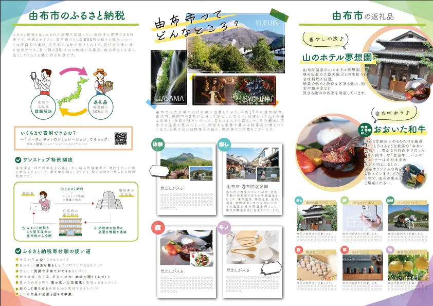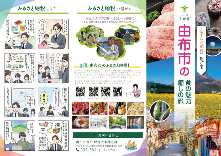 由布市のふるさと納税紹介用のリーフレットの制作を担当させて頂きました。由布市のふるさと納税の返礼品には、由布院の旅館で使える宿泊補助券、クーポン券、お肉、フルーツ、ミネラルウォーター、スイーツなど由布の魅力的な品がたくさん揃っています。デザインから印刷までワンストップで対応をさせて頂きました。