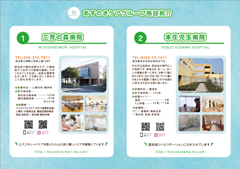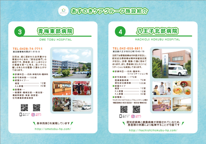 埼玉県を中心に営業をされているあすのきケアグループ様よりご依頼を頂いた三芳の森病院、本庄児玉病院、青梅東部病院、八王子北部病院の施設紹介用のA4チラシのデザイン・印刷を担当させて頂きました。