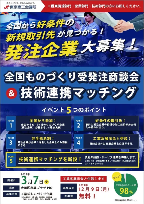 東京商工会議所様からご依頼を頂いた技術連携マッチングのチラシの制作実績となります。製造業関連のイベントという点が伝わりやすいよう意図してデザインをさせて頂きました。