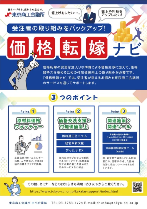 東京商工会議所様からご依頼を頂きました価格転嫁ナビA4チラシのデザインの制作実績となります。 東京商工会議所が提供する価格転嫁ナビ・サービスは、受注者の価格交渉力向上を支援するウェブサイトです。原材料価格の動向把握や価格交渉支援、付加価値向上策などを提供しています。