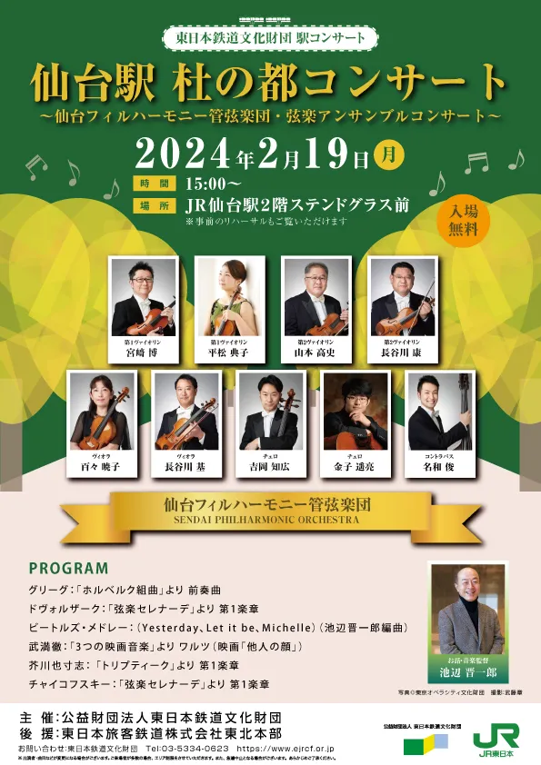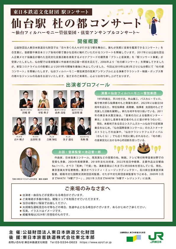 鉄道文化財団様 仙台駅コンサート 告知用チラシ制作 チラシ マエダシンサク 鉄道文化財団様 仙台駅コンサート 告知用チラシ制作 業種 告知用チラシ制作 サイズ A4サイズ ページ数 1 加工 – コメント 鉄道文化財団様 仙台駅コンサート「杜の都コンサート」告知用チラシの制作を担当させて頂きました。 仙台フィルハーモニー管弦楽団による弦楽アンサンブルコンサートが JR仙台駅2階ステンドグラス前にて賑やかに開催されました。 チラシのデザインから印刷までワンストップで対応をさせて頂きました。 【仕様】A4チラシ・両面デザイン・印刷 川越デザインワークスのパンフレットデザイン実績 理化学研究所様 一般公開2024パンフレット 2025年11月11日 詳細ページへ サン電通エンジニアリング パンフレット 2025年11月11日 詳細ページへ 神奈川工科大学様 ポケットフォルダー付きパンフレット 2025年10月31日 詳細ページへ 森久保CAメディカル株式会社様 三つ折りリーフレット 2025年10月31日 詳細ページへ 理化学研究所様 一般公開公開用イベントパンフレット 2025年10月31日 詳細ページへ SOMPOインスティチュート・プラス様 生産性に関する研究会の報告パンフレット Vol.2 2025年10月31日 詳細ページへ SOMPOインスティチュート・プラス様 生産性に関する研究会の報告パンフレット Vol.1 2025年10月31日 詳細ページへ 国土交通省航空局様 採用案内パンフレット制作 2025年10月31日 詳細ページへ 鉄道博物館様-企画展パンフレット制作 2025年10月31日 詳細ページへ 厚生労働省様-公的年金シミュレーター・利用案内パンフレット 2025年10月27日 詳細ページへ 川越デザインワークスへのパンフレット制作に関するお問い合わせはこちら 049-249-3731 この記事を書いた人 ディレクター 前田 晋作 過去に100社以上のパンフレットの制作実績を有する経験豊富なディレクター兼デザイナー。「都内+パンフレット制作」のキーワードで自社サイトをGoogle検索で1位に表示掲載させた実績を持つ。 大手企業や国土交通省、厚生労働省などの官庁関連のパンフレットの制作を多く手掛ける。パンフレットのデザインから印刷まで幅広い業務内容に精通。