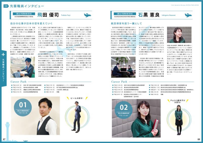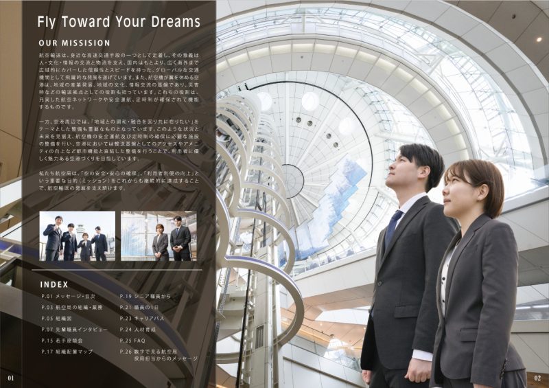 国土交通省東京航空局様からご依頼を頂いた採用パンフレットの制作実績となります。 航空局様の概要や特徴を伝えるための重要な手段です。企業の歴史、ビジョン・ミッション、製品やサービスの特徴、文化や価値観など、読者に航空局の理解を深めるための情報を適時記載させて頂きました。 他に募集職種や資格要件、福利厚生、キャリアパス、研修プログラムなど、求職者が知りたいと思う情報を記載。スタッフの声や成功事例を掲載し、読者に自身のキャリア選択に対するインスピレーションを得ることができるよう意図して制作をいたしました。 【仕様】採用案内パンフレット 【用紙】コート135k 【ページ数】28ページ